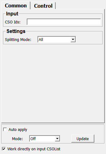 Attach a CSOList to the module’s input and enter a list of CSO ids into the according field for selecting the subset of CSOs that should be split. If the module does not work directly on the input CSOList (have a look at the according field), the module copies the input CSOList to its output and performs on the copied output list.
