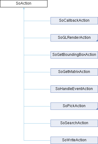 SoAction is the abstract base class for all actions. Classes derived from SoAction define operations to be applied at each node encountered during traversal of a scene graph. The function that gets called to implement the action for a particular node type is determined by a lookup table in the global database.