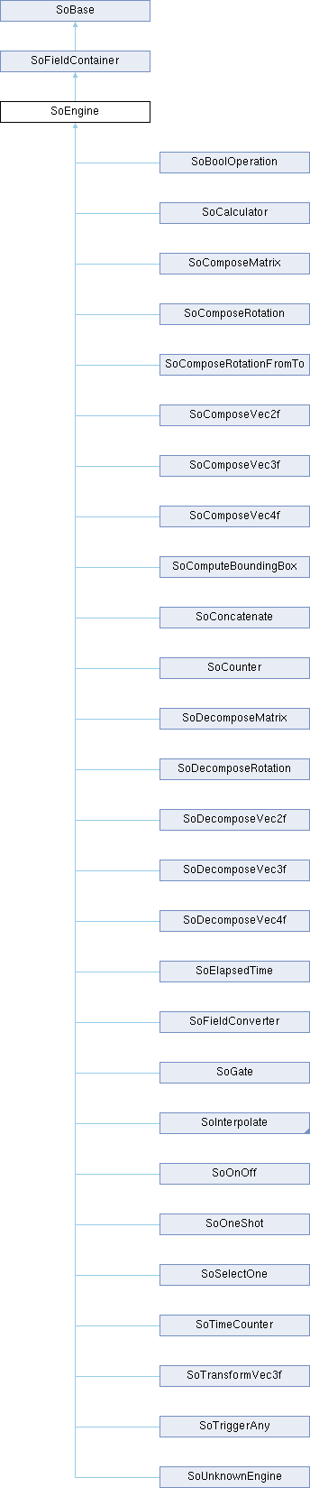 SoEngine is the abstract base class for all engines. Engines are objects used for animation and behavior. They are lightweight objects that are connected between nodes, the clock, and other engines to form interesting behaviorial objects (e.g., a spinning windmill).