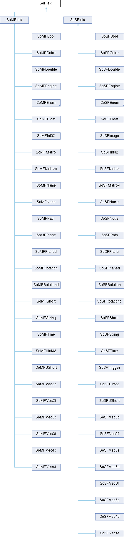 There are two abstract subclasses of SoField: SoSField is the base class for all single-valued field classes and SoMField is the base class for all multiple-valued fields, which contain dynamic arrays of values. Subclasses of SoSField have an SoSF prefix, and subclasses of SoMField have an SoMF prefix. See the reference pages for SoSField and SoMField for additional methods.