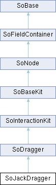 SoJackDragger is a composite dragger in the shape of a jack from the children's game jacks. Three lines along the x, y, and z axes form the central star shape, which you can drag with the mouse to rotate the jack. Dragging any of the small cubes mounted at the end of the axes will scale the jack uniformly in all 3 dimensions. At the core of the jack is an SoDragPointDragger for translating the jack.