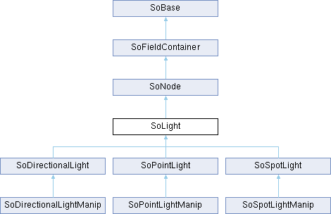 SoLight is the abstract base class for all light nodes. A light node defines an illumination source that may affect subsequent shapes in the scene graph, depending on the current lighting style. Light sources are affected by the current transformation. A light node under a separator does not affect any objects outside that separator.
