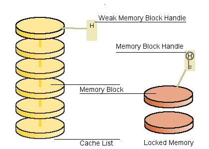 The image below shows that the cache list contains only those memory blocks that are exclusively referenced by weak handles. The memory blocks that exist outside the cache list are always referenced by at least one strong handle and may also be referenced by weak handles.