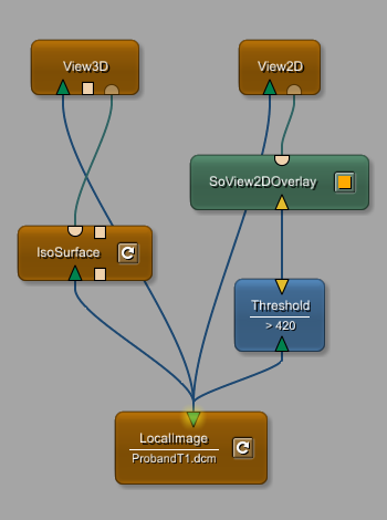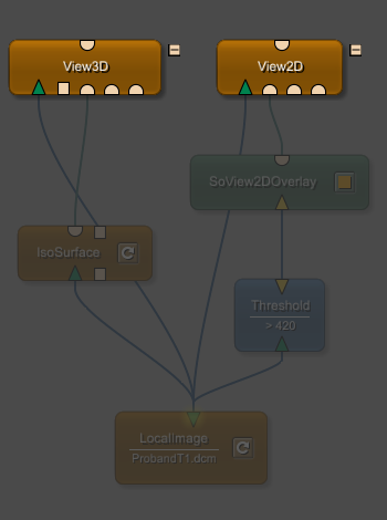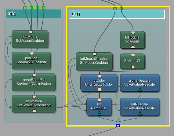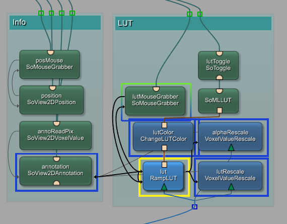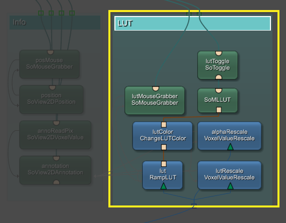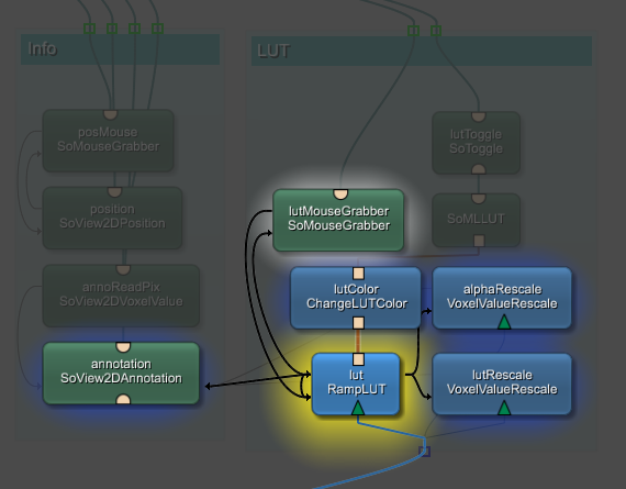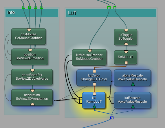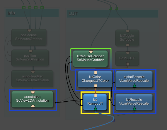 To improve the visibility of connections between modules in a more complex network, a special highlighting mechanism is available: When selecting modules in a network and then pressing SPACE, the workspace is darkened and only the selection and its directly connected modules are highlighted. Pressing SPACE again toggles back to the normal view. In the following example screenshot, the “lut” module is connected via four parameter connections and two data connections, which cannot be easily seen in the non-highlighted display.