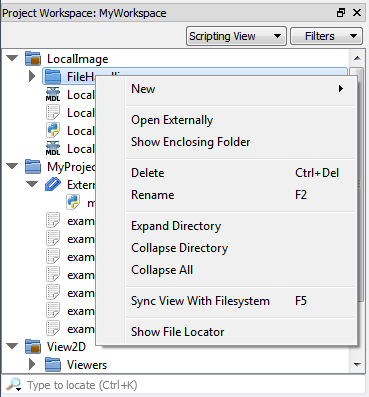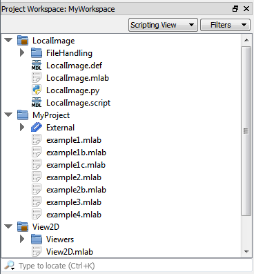 MATE offers two different views for the project workspace: the Scripting View and Filesystem View. Those views allow to manage exclude filter rules for the displayed files and directories. The Scripting View includes several rules by default, which aim at showing only relevant files and directories for scripting MeVisLab modules.
