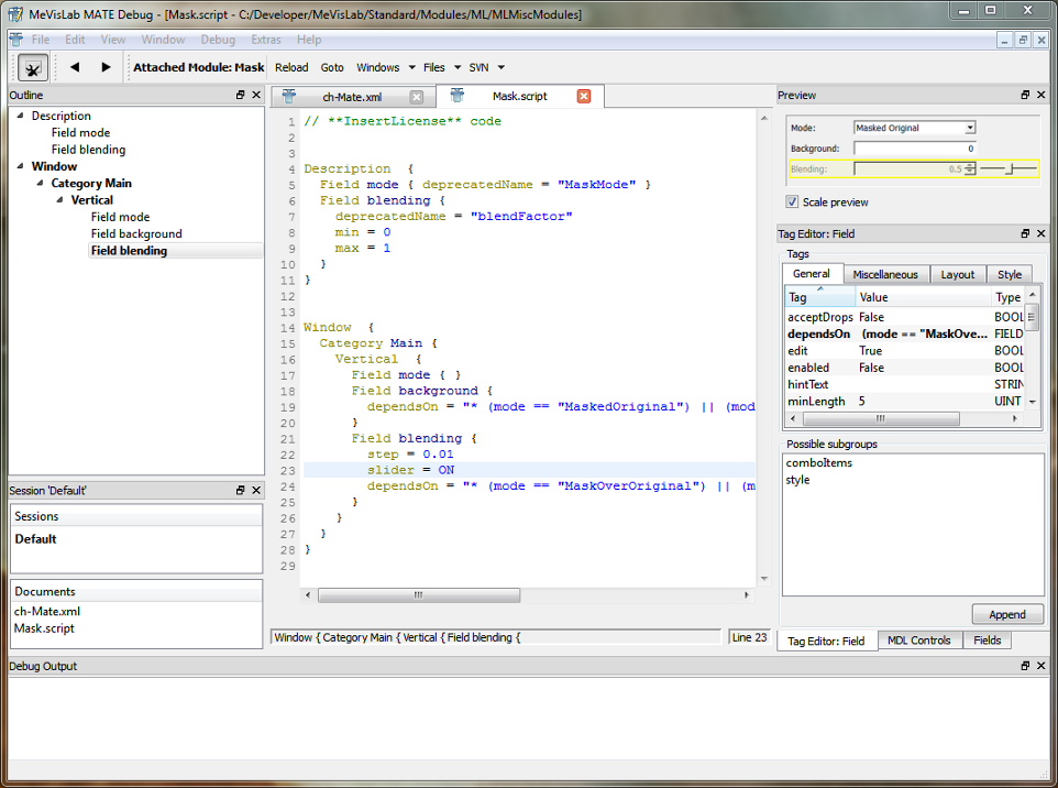 In the screenshot below, the GUI description of the Mask module is being edited in MATE's GUI editor. In the editing window, the text cursor is set to the description of the field blending