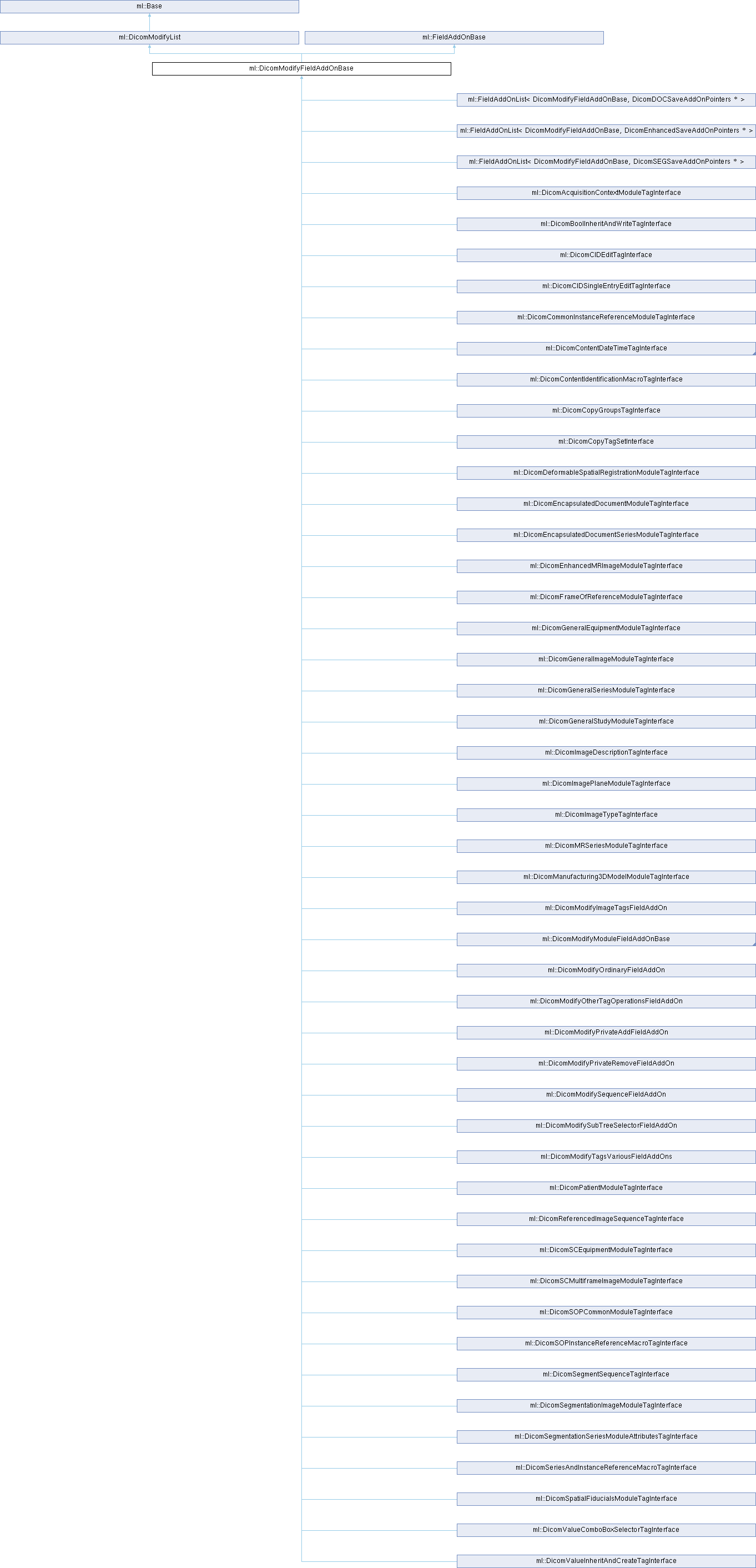 The class DicomModifyFieldAddOnBase is dedicated to manage fields for ML modules and instances derived from DicomModifyBase to combine field handling and tag modification functionality to modify DCMTree's and to allow concatenation of them to pipelines. More...