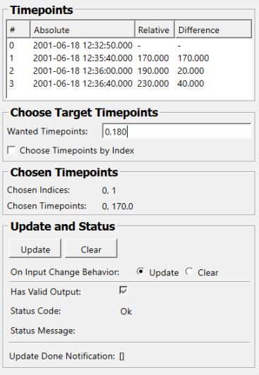 Connect the input image to the input field, provide the list of desired time points as coma separated field in Wanted Timepoints and press update.
