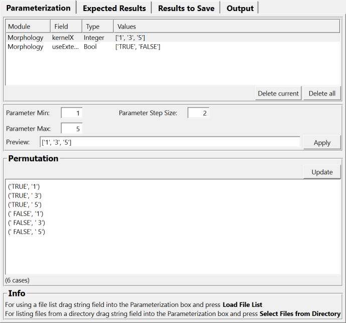If your parameter list is complete, click Update in the Permutation box to generate a list with all parameter permutations.